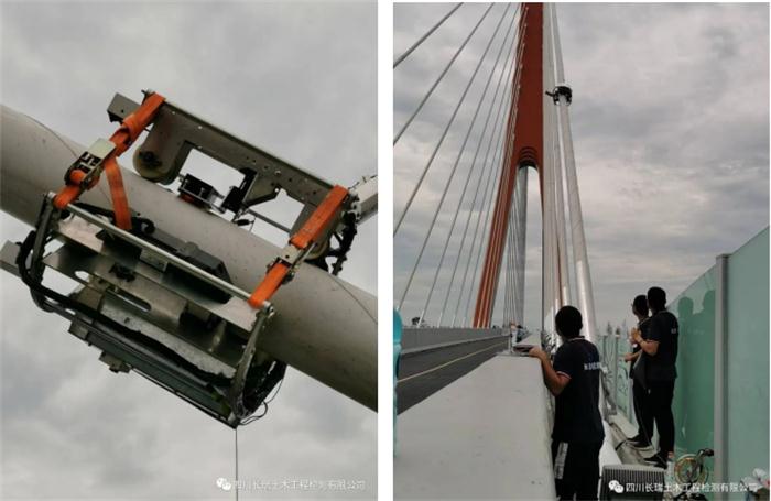 經(jīng)過一年的不懈努力,由我公司牽頭研發(fā)的橋梁爬索機(jī)器人已實(shí)現(xiàn)實(shí)橋檢測(cè)功能。該機(jī)器人包括主框架、爬行機(jī)構(gòu)、攝像頭、端部感應(yīng)傳感器、索力傳感器及自動(dòng)貼緊機(jī)構(gòu);索力傳感器自動(dòng)貼緊機(jī)構(gòu)可精確地控制索力傳感器和拉索緊密貼合,實(shí)現(xiàn)對(duì)橋梁拉索索力精準(zhǔn)采集。爬索機(jī)器人設(shè)備和控制系統(tǒng)間采用無線通信,實(shí)現(xiàn)遠(yuǎn)程控制及數(shù)據(jù)傳輸。頂部設(shè)置攝像頭拍攝橋梁拉索外觀圖像,距離編碼器采集設(shè)備爬行距離,距離在與圖像實(shí)時(shí)同步更新以實(shí)現(xiàn)拉索外觀圖像的直觀展現(xiàn),也便于后期檢測(cè)人員通過回放視頻對(duì)外觀病害成因進(jìn)行詳細(xì)分析?;谠撛O(shè)備具有檢測(cè)效率高、檢測(cè)參數(shù)多、可靠性強(qiáng)、能耗低、使用和維護(hù)成本低等特點(diǎn),其可適應(yīng)國(guó)內(nèi)各種斜拉橋、纜索橋、拱橋索桿外觀及索力檢測(cè)。