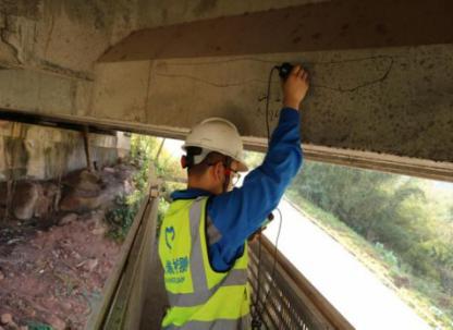 項目負(fù)責(zé)人合理安排現(xiàn)場檢測時段,通過橋檢車作業(yè)平臺,采用裂縫寬度測試儀、精密水準(zhǔn)儀、鋼筋銹蝕電位儀、一體式鋼筋檢測儀等設(shè)備對受檢橋梁進(jìn)行了詳細(xì)檢測。歷時2天,順利完成護(hù)國大橋和護(hù)國巖大橋現(xiàn)場檢測工作。